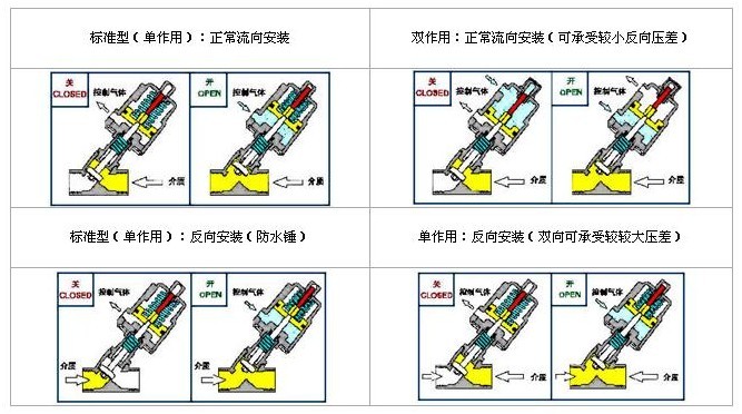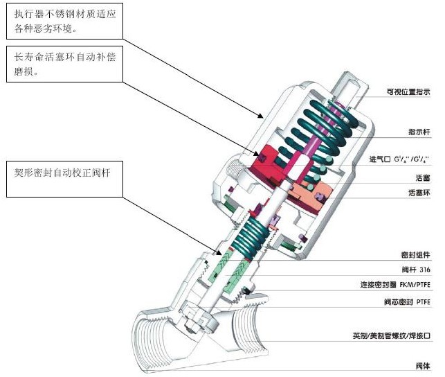 ■Y型结构,流阻小、防水垂欧洲风格, ■设计精巧,契形密封,自润滑、免维护 ■全不锈钢制造,适应医疗卫生、超净、食品及恶劣环境 ■任意角度安装 技术参数 | 控制方式 | 常闭、常开、双作用、单作用 | 介质温度 | -20℃~+180℃ | 环境温度 | -20℃~+80℃ | 气源压力 | 4~8bar | 工作压力 | 0~8bar、0~16bar,(视执行器配置和气源压力而异) | 连接方式 | 内螺纹(特制:焊接、法兰) | 附件选项 | 电磁阀、位置反馈 | 阀体材质 | SS304、SS316、SS316L | 气缸材质 | SS304、铝、PPS塑料 | 密封材料 | PTFE、FPM | 流体粘度 | ≤600mm2/S |