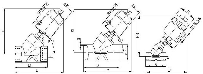 外形尺寸(金属执行器): 型号规格 | 接口 | 内孔 | KV值 | φE | 螺纹式 | 焊接式 | L1 | L | H1 | L3 | H2 | L2 | O.D | S | WTY200110 | G3/8″ | 10 | 3.8 | 55 | 56 | 120 | 126 | 70 | - | - | 17.2 | 2.5 | WTY200115 | G1/2″ | 13 | 4.5 | 60 | 68 | 133 | 126 | 70 | 126 | 140 | 21.3 | 2.5 | WTY200120 | G3/4″ | 18 | 9.5 | 60 | 75 | 137 | 131 | 82 | 131 | 136 | 26.9 | 3 | WTY200125 | G1″ | 24 | 18.1 | 60 | 90 | 149 | 140 | 100 | 140 | 150 | 33.7 | 3.5 | WTY200132 | G1 1/4″ | 31 | 23.1 | 78 | 116 | 188 | 175 | 125 | 175 | 193 | 42.4 | 4.5 | WTY200140 | G1 1/2″ | 35 | 32.9 | 78 | 116 | 190 | 178 | 130 | 178 | 193 | 48.3 | 4.5 | WTY200150 | G2″ | 45 | 52.8 | 78 | 138 | 203 | 184 | 155 | 184 | 206 | 60.3 | 5 | WTY200165 | G2 1/2″ | 60 | 90 | 98 | 168 | | | | | | | | WTY200180 | G3″ | 75 | | 120 | 190 | | | | | | | |